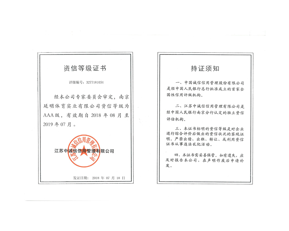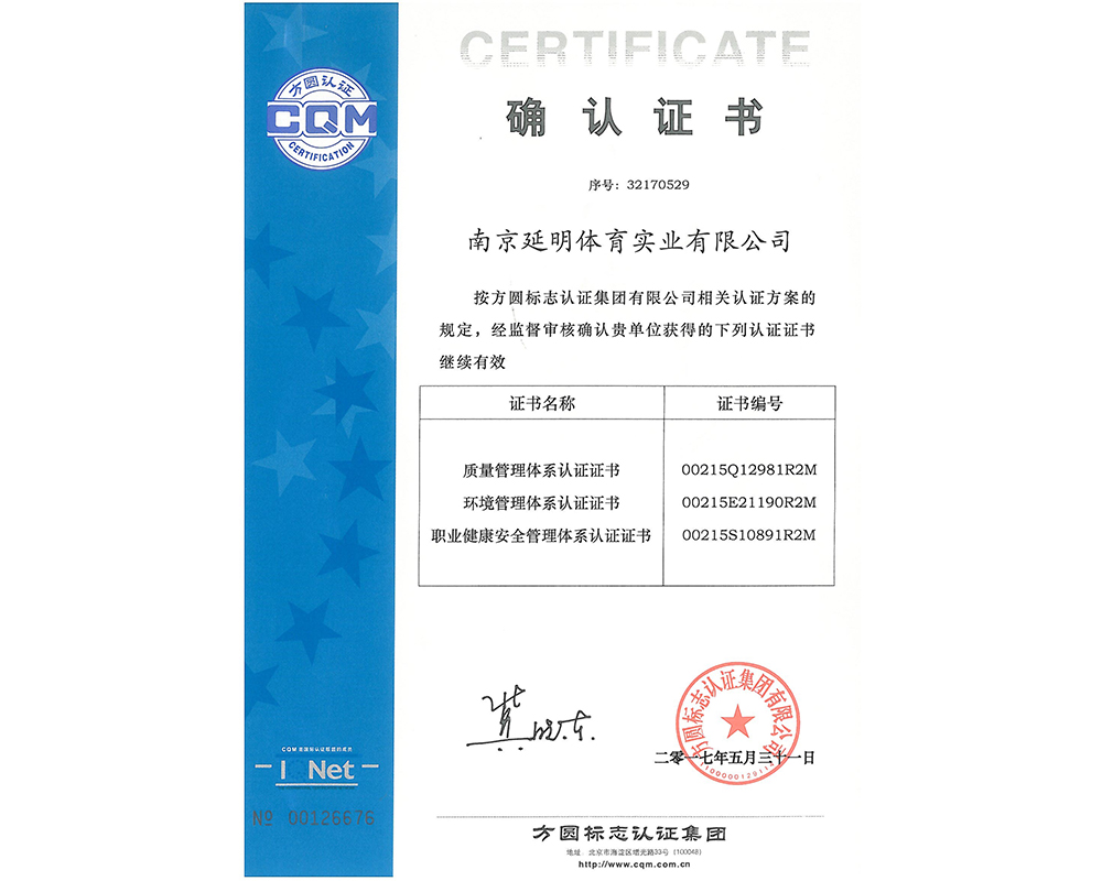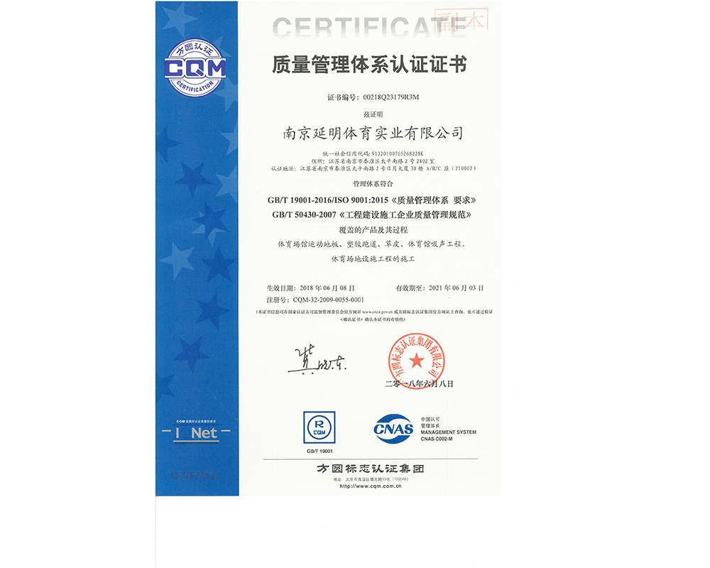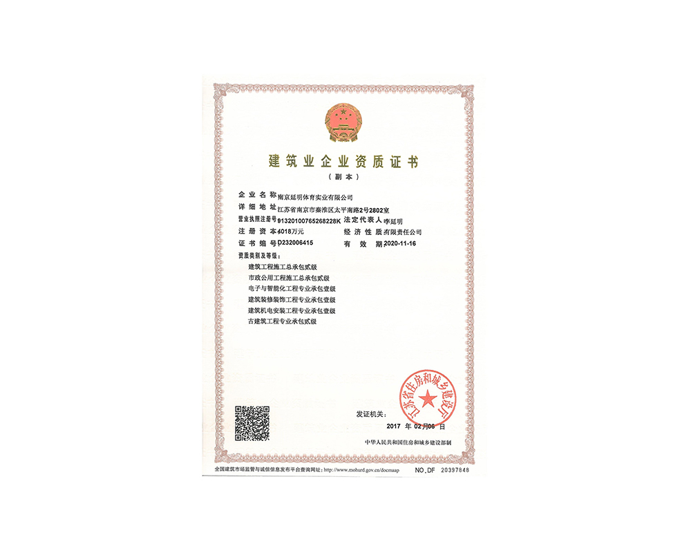 作為江蘇省體育產(chǎn)業(yè)示范單位,延明體育擁有多年相關(guān)工程總承包施工經(jīng)驗,取得建筑工程施工總承包二級、古建筑工程專業(yè)承包二級、建筑裝修裝飾工程專業(yè)承包一級、電子與智能化工程專業(yè)承包一級、市政公用工程施工總承包二級資質(zhì);通過ISO 9001:2015質(zhì)量管理體系認證;通過ISO14001:2015環(huán)境管理體系認證;通過IOS45001:2018職業(yè)健康安全管理體系認證。