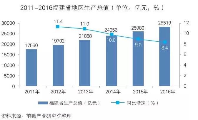 福建省在2011到2016年GDP呈上升趨勢且增速較快,為體育發(fā)展事業(yè)提供了堅(jiān)實(shí)基礎(chǔ),有利于體育產(chǎn)業(yè)的發(fā)展。2016年,福建省地區(qū)生產(chǎn)總值達(dá)到28519億元,同比增長8.4%。